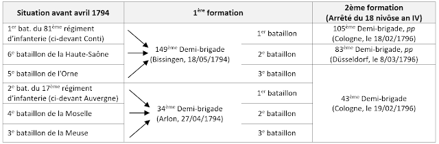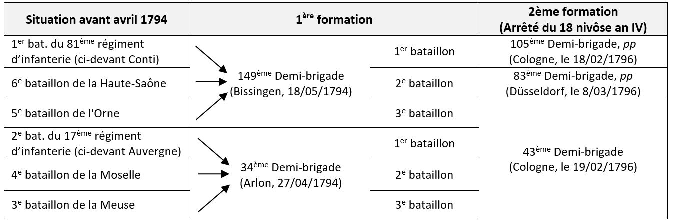 - 19/02/1796 : L’ancienne 34ème Demi-brigade forme avec le 3ème bataillon de 149ème demi-brigade la 43ème Demi-Brigade de ligne.