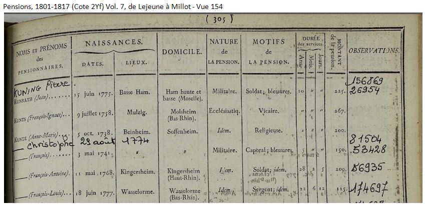 - Dossier de pension militaire de Jean KUNRATG – SHD, Cote 2Yf 26954)
